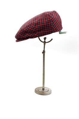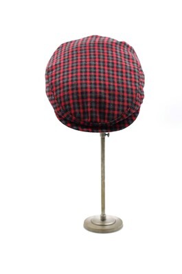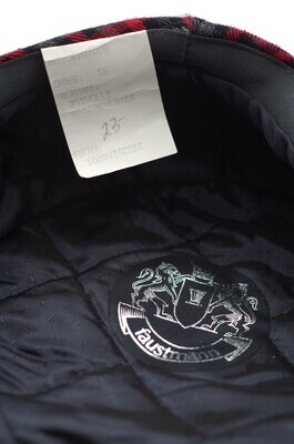 Diese Schiebermütze, oder auch Flat Cap genannt, ist von der Firma Faustmann. Der Oberstoff ein Wollmischgewebe, das nach Etikett aus 35% Wolle und aus 65% Polyester besteht. Es ist köpergebunden und hat ein schwarz-graues Unter- und ein rotes Überkaro. Das Dach ist mittels Abnäher in Form gebracht und setzt an der vorderen unteren Hälfte an ein weiters Schnittteil an. Im Inneren findet sich ein graues Schweißband, aus einem Köpergewebe. Die Flat Cap ist wattiert und gefüttert. Der Futterstoff ist ein, in Rauten abgestepptes, und mit dezentem grafischen Muster versehenes, dunkelgraues Viskosegewebe. Mittig ist das kreisrunde Markenetikett aufgebracht. Es besteht aus schwarzem Satin mit silbernem Druck und zeigt den Firmennamen 'Faustmann' in einem Banner unter einem Wappen mit einem Zylinder, das bekrönt und von zwei steigenden Löwen flankiert wird. Ein Etikett mit den handelsüblichen Angaben ist zwischen das Schweißband und dem Oberstoff festgenäht. Auf dieses wurde mit Bleistift, handschriftlich der Preis von 23,- geschrieben. Das Modell ist einmal in der Weite 56 vorhanden. Es ist in einem guten Zustand, jedoch beginnt am rechten, hinteren Abnäher der Stoff auszureißen.