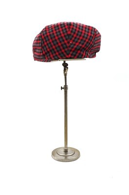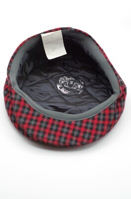 Diese Schiebermütze, oder auch Flat Cap genannt, ist von der Firma Faustmann. Der Oberstoff ein Wollmischgewebe, das nach Etikett aus 35% Wolle und aus 65% Polyester besteht. Es ist köpergebunden und hat ein schwarz-graues Unter- und ein rotes Überkaro. Das Dach ist mittels Abnäher in Form gebracht und setzt an der vorderen unteren Hälfte an ein weiters Schnittteil an. Im Inneren findet sich ein graues Schweißband, aus einem Köpergewebe. Die Flat Cap ist wattiert und gefüttert. Der Futterstoff ist ein, in Rauten abgestepptes, und mit dezentem grafischen Muster versehenes, dunkelgraues Viskosegewebe. Mittig ist das kreisrunde Markenetikett aufgebracht. Es besteht aus schwarzem Satin mit silbernem Druck und zeigt den Firmennamen 'Faustmann' in einem Banner unter einem Wappen mit einem Zylinder, das bekrönt und von zwei steigenden Löwen flankiert wird. Ein Etikett mit den handelsüblichen Angaben ist zwischen das Schweißband und dem Oberstoff festgenäht. Auf dieses wurde mit Bleistift, handschriftlich der Preis von 23,- geschrieben. Das Modell ist einmal in der Weite 56 vorhanden. Es ist in einem guten Zustand, jedoch beginnt am rechten, hinteren Abnäher der Stoff auszureißen.