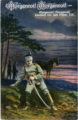 Auf der Vorderseite: Stark nachbearbeitete Fotopostkarte im Hochformat. Unter der Überschrift "Morgenrot! Morgenrot!" und dem Zweizeiler "Morgenrot! Morgenrot! Leuchtet mir zum frühen Tod." eine Szene im Morgenrot: Ein Soldat in Ulanenuniform sitzt sinnend, vielleicht ermüdet von der Wache, auf einer kleinen Erhebung, den Blick leicht gesenkt. Er stützt sich mit der rechten Hand seitlich auf einem Felsen ab, die linke umschließt den Griff seines Säbels, den er locker zwischen seinen Beinen aufgestellt hat. Im Hintergrund heben sich ein Pferd und zwei Kameraden, ebenfalls mit Tschapka und Säbel ausgestattet, dunkel vom Hintergrund ab. Am Horizont beginnt das Morgenrot die düstere Szene zu erhellen. Auf der Rückseite: Serie: "L. & P.; Morgenrot! Morgenrot!, Serie 5650". Handschriftlicher Text: "Ich habe den ganzen Stall gesehen. 11.11.16."
