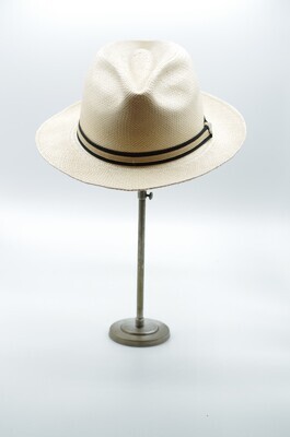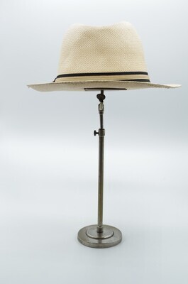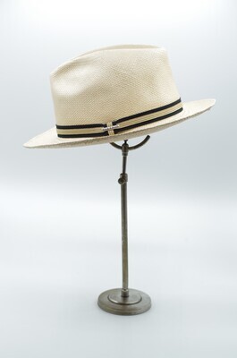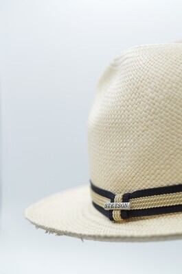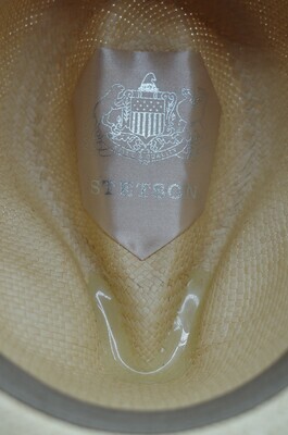 Dieser Panama Strohhut ist von der Firma Stetson. Das Stroh ist vom Farbton naturbelassen und natürlich. Er hat ein schmales dunkelblaues Hutband, auf das ein dünneres geflochtenes Zierband in Blau, Beige und Braun aufgenäht ist. Die Stelle, an der sich das Hutband überschneidet ist mit einer Schlaufe verdeckt, die zusätzlich eine längliche, nickelfarbene Metallniete mit Stetson-Prägung trägt. Die Krempe ist etwas 0,5cm nach unten umgeschlagen und festgesteppt. Im Inneren ist ein graubeiges Schweißband, das mit einem Vlies unterlegt und vierfach abgesteppt ist. Auf ihm sind zwei Aufdrucke in Beige. Auf der einen Seite steht 'STETSON. AN AMERICAN SPIRIT' und gegenüber ist der Druck 'GENUINE PANAMA. HANDWOVEN IN ECUADOR' platziert. Hinten am Schweißband ist noch ein Etikett mit den handelsüblichen Angaben zu finden. Der Hut ist ungefüttert. Im vorderen Dach, bei den beiden Kniffen, ist ein farbloser Kunststoff zur Versteifung eingegossen, um der Spitze Stabilität zu geben. Im Dach selbst ist die Stetson-Applikation angebracht. Sie hat einen silbernen Druck auf einem Stück beigefarbenem Satin in Form eines siebeneckigen Wappens. Das Branding selbst zeigt auch ein Wappen mit 13 Sternen und 13 Streifen. Flankiert wird es von einem Biber, der auf die Entstehung des ersten Stetson Hutes ,Boss of the Plains', den John B. Stetson aus der Unterharr von Biberfellen filzte, verweist und auf der anderen Seite von einem Vogel. In einem Banner darunter steht 'Style and Quality' und darunter groß der Firmenname 'STETSON'. Der Hut ist einmal vorhanden. Größe und Preis sind nicht angegeben. Er ist in einem guten Zustand, lediglich das Stroh an der umgeschlagenen Krempe beginnt leicht auszureißen.