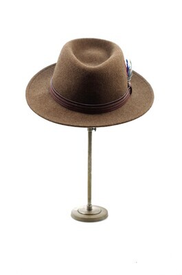 Dieser Stetson Trilby, aus braun meliertem Wollfilz hat diesen ursprünglichen, amerikanischen, wild-west Charakter. Die Form ist für einen Trilby etwas ungewöhnlich. Die Kniffe in der Krone sind ganz zart, kaum sichtbar und die Krempe ist fast plan, hinten ein wenig nach oben gebogen. Sie ist underwelt verarbeitet, also etwa 1cm nach unten umgeschlagen und festgesteppt. Das Hutband ist aus einem rotbraunem Lederstreifen, auf dem ein weiterer, dunkelbrauner Lederstreifen aufgesteppt ist. Er verläuft auf der linken Seite durch eine ebenso gestaltete Schlaufe und endet ein Stück danach überlappend. Auf dem Übertritt ist eine messingfarbene Niete mit Stetsonprägung angebracht. Die linke Seite ist zudem mit einer Federgarnitur geschmückt, die aus bunt gefärbten Federn besteht. Im Inneren findet sich ein Schweißband, das aus einem braunen Fischgratgewebe besteht. Es ist gefüttert und oben, wie unten abgesteppt. An der Verschlussnaht ist eine beige Zierschleife angebracht. Auf das Schweißband ist 'COVEDALE', '100% WOOL' und 'STETSON' aufgedruckt. Der Hut ist ungefüttert. Im Dach ist der Hut mit orangefarbenem Flockdruck gebrandet. Das Modell ist einmal in der Größe M (66) vorhanden. Es handelt sich um ein Schaufenstermodell. Der Filz ist bereits stark ausgeblichen, was an der Vorderseite gut sichtbar wird, da dort ein Einsteckschild positioniert war. An dieser Stelle ist noch die ursprüngliche Farbe zu erkennen. Sonst befindet sich der Hut in einem guten Zustand.