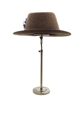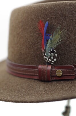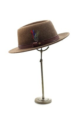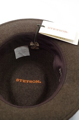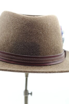 Dieser Stetson Trilby, aus braun meliertem Wollfilz hat diesen ursprünglichen, amerikanischen, wild-west Charakter. Die Form ist für einen Trilby etwas ungewöhnlich. Die Kniffe in der Krone sind ganz zart, kaum sichtbar und die Krempe ist fast plan, hinten ein wenig nach oben gebogen. Sie ist underwelt verarbeitet, also etwa 1cm nach unten umgeschlagen und festgesteppt. Das Hutband ist aus einem rotbraunem Lederstreifen, auf dem ein weiterer, dunkelbrauner Lederstreifen aufgesteppt ist. Er verläuft auf der linken Seite durch eine ebenso gestaltete Schlaufe und endet ein Stück danach überlappend. Auf dem Übertritt ist eine messingfarbene Niete mit Stetsonprägung angebracht. Die linke Seite ist zudem mit einer Federgarnitur geschmückt, die aus bunt gefärbten Federn besteht. Im Inneren findet sich ein Schweißband, das aus einem braunen Fischgratgewebe besteht. Es ist gefüttert und oben, wie unten abgesteppt. An der Verschlussnaht ist eine beige Zierschleife angebracht. Auf das Schweißband ist 'COVEDALE', '100% WOOL' und 'STETSON' aufgedruckt. Der Hut ist ungefüttert. Im Dach ist der Hut mit orangefarbenem Flockdruck gebrandet. Das Modell ist einmal in der Größe M (66) vorhanden. Es handelt sich um ein Schaufenstermodell. Der Filz ist bereits stark ausgeblichen, was an der Vorderseite gut sichtbar wird, da dort ein Einsteckschild positioniert war. An dieser Stelle ist noch die ursprüngliche Farbe zu erkennen. Sonst befindet sich der Hut in einem guten Zustand.