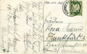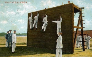 Auf der Vorderseite: Die nachkolorierte Fotopostkarte im Querformat mit dem Titel "Soldatenleben" zeigt mehrere Soldaten im Drillichanzug beim Übersteigen einer Kletterwand. Auf der Rückseite: Adressat: "Fräulein Rosa Maun / Frankfurt a.M. / Beethovenstr. 44 / b. Herrn Dr. Oppenheimer", Stempel: "Nürnberg 26. Nov.", Serie: "CGL; 107", Postwertzeichen: "Bayern 5 Pfennig". Handschriftlicher Text: "Liebe Schw. Hast Du meine Kte. Nicht erhalten? Herzl. Grüße Dein Wilhelm. (...) Infanterist Maun, 14. Inf. Rgt., 4. Comp. Nürnberg".
