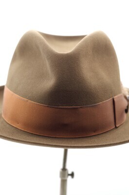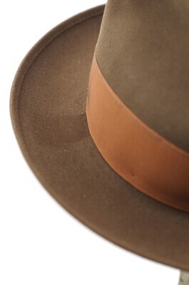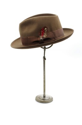 Ein Trilby aus braunem Velours aus der Exclusive-Linie der Firma Mayser. Er hat ein 4cm breites, rotbraunes Hutband aus Ripsband, das an der oberen Kante festgeheftet ist. An der linken Seite ist es zu einer Schleife gekniffen, mit doppelter Schlaufe geschlossen und mit einer Federgarnitur geschmückt. Auf der Schlaufe ist ein nickelfarbener Masyseraufnäher angebracht. Die Krempe ist overwelt verarbeitet, also der Krempenrand ist nach oben umgeschlagen und festgesteppt. Sie ist rundherum leicht nach oben gewölbt. Im Inneren ist ein textiles Schweißband mit eingewebten Zierstreifen. Der oberste von ihnen ist breiter und rot akzentuiert. An der Naht ist ein kleiner, roter, siegelartiger Maysersticker angebracht. Gefüttert ist er mit einem weißbeigem Satin, der zum Dach hin gleichmäßig eingekniffen ist. Das Dach selbst ist mit dunkelbraun Satin gefüttert und foliert. Es trägt den Mayseraufdruck im Medaillenreigen und den Zusatz Exclusive, der mit drei Sternen dekoriert ist. Der Druck ist Gold und Rot. Das Modell ist einmal vorhanden. Der Hut hat die Größe 57, ein Preis ist nicht eingetragen. Da es sich um ein Schaufensterexponat handelt ist die Oberseite stark verblichen. Sichtbar wird dies vor allem an den Stellen, an denen Einsteckschilder gesteckt haben: Frontal und an der rechten hinteren Seite. Die ganze Oberseite hat durch die Sonneneinwirkung einen Grünstich bekommen. Die Folie im Futterdach ist zudem vergilbt.