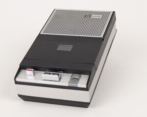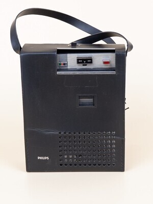 Ein kleiner Cassetten Recorder, in schwarzer Tragetasche, die als Zubehör erhältlich war. Produziert ca. 1968 von Philips in Holland. Die Funktionen Start/Stopp, Vor- und Rücklauf werden über eine einzige Taste gesteuert. Zusammen mit dem Aufnahmeknopf und der Aussteuerungsanzeige sind dies die einzigen Bedienelemente des Recorders. Seitlich sind die externen Anschlüsse eingebaut, sowie zwei Drehregler mit denen die Lautstärke und Eingangsempfindlichkeit für die Aufnahme gesteuert werden. Das Gerät ist sehr gut erhalten und ist mit 5 x 1,5 Volt Batterien funktionsfähig.