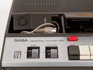 Mittelgroßer, tragbarer Recorder von Saba. Produziert in den Jahren 1970/1971. Die dominant angeordneten Drucktasten dienen zur Funktionen des Recorders. Die Drehregler zur Einstellung von Lautstärke und Klang. Eine Aufnahmetaste, eine Austeuerungsanzeige und ein Druckknopf zum öffnen des Kassettenschachts runden den Bedienteil ab. Das Gerät kann mit 6x1,5 Volt Batterien oder mit 220 Volt (Kabel ist eingebaut) betrieben werden. Seitliche Anschlüsse sind für Radio, Kopfhörer und Microfon vorhanden. Eine Besonderheit ist das mitgelieferte, im Gehäuse integrierte, kleine Microfon hinter einer Abdeckung auf der Oberseite. Der Recorder kostete 1970 ca. 250 DM.