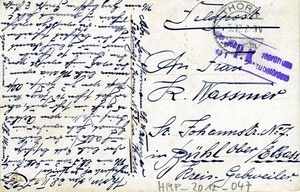 Auf der Vorderseite: Nachkolorierte Fotopostkarte im Hochformat. Soldat in Marschausrüstung sitzt in nachdenklicher Haltung unter einem Baum auf einem Feld. Links oben im Bild die Dame seines Herzens neben einem Rosenstrauch. Aufgedruckter Text: "Ich weiß ein Herz / für das ich bete. Mehr als mein sehnend Aug’ erflehte, / Durchdrang mich neuer Lebensmut. / Ich weiß ein Herz für das ich bete, / Und diese Herz es ist mir gut.". Auf der Rückseite: Adressat: "Frau K. Wassmer / St. Johannstr. No. 7 / in Bühl Ober/Elsass / Kreis-Gebweiler.", Stempel: "Thorn 1.3.17", Serie: "L&P; 5702/VI". Handschriftlicher Text: "No. 87. Thorn, den 28.II.17. Meine lb. Frau und lb. Kind! Der liebe Gott beschütze euch alle in der lieben Heimat, habe wieder ein Brief erhalten von Arthur es geht i(h)m sehr gut, aber er hat schon 14 Tage keine Post von zu Hause. Also meine liebe Maria wenn du was nicht weißt von den Bienen (?) so schreibe mir nur gleich damit ich dir bescheid schreiben kann. du weißt ja welchen Scharin (?) ich damit gemeint habe? Meine herzlichsten Grüße und Küße von deinem lb. Mann. Abs. Landsturmmann R. Wassmer / Festungs-Komp. No.2 in Thorn.".