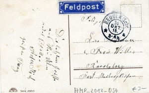 Auf der Vorderseite: Nachkolorierte Fotopostkarte im Hochformat. Der Titel ist "Leb wohl mein Bräutchen". Szene in bürgerlichem Wohnzimmer. Soldat in Marschausrüstung und städtisch gekleidete junge Frau halten kurz vor dem Abschiedskuss noch einmal inne. Text: "Weit fort, fort übern deutschen Rhein / Dabei muß dein Geliebter sein.". Auf der Rückseite: Adressat: "Lisi Thalmeier (?), b. Frau Willis, Karolsberg (?), Post Oberbergkirchen", Stempel: "Neuulm 30.Okt. 15 3-4 N.", Serie: "R. & K. L.; 2593/3". Handschriftlicher Text: "Die letzten Grüße aus Neu Ulm sende Euch allen Peter Hörl (?) Grüße an Franz".