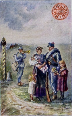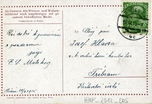 Auf der Vorderseite: Mit Blumen geschmückter Soldat mit Frau und drei Kindern. Signatur unten rechts: "(...) 1911.". Auf der Rückseite: Adressat: "Josef Hlavsa, Pribram", Stempel: "Wien", Verlag: "Jos. Roller & Co., Wien", Postwertzeichen: "Kaiserliche Königliche Österreischische Post 5 Heller", Aufdruck: "Zu Gunsten des Witwen- und Waisenhilfsfond nach Angehörigen der gesamten bewaffneten Macht. Verkaufspreis 10 Heller". Handschriftlich beschrieben in tschechischer / slowenischer Sprache.