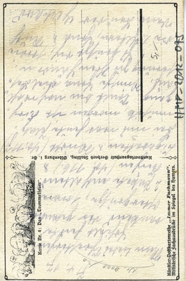 Auf der Vorderseite: Scherzpostkarte im Hochformat: 2 Soldaten umringt von 5 lachenden und scherzenden Frauen vor einem Hauseingang. Aufgedruckter Text: "Trommelfeuer.". Auf der Rückseite: Serie: "Kunstverlagsanstalt Gerhard Stalling, Oldenburg i. Gr.; Künstler-Postkartenreihe "Immer Fachmann". Militärische Fachausdrücke im Spiegel des Humors. Karte Nr. 4: Das "Trommelfeuer".". Handschriftlicher Text: "7.4.17 Mein liebes Schwesterchen! Erhielt heute dankend die gesandten Ostergrüße, sowie 2 Pakete enthaltend Kuchen (So, 11.6.) & Cigaretten & Wurst (So., 11.7.) Bei mir war heute ...-musik, morgen ist Kirchgang. Sonst bin noch wohl auf, Wünsche Erna viel Besserung zu Ihren Händen. Es grüßt Dich, sowie die l. Eltern, Erna & Ruth, Dein Bruder Gerhard.".