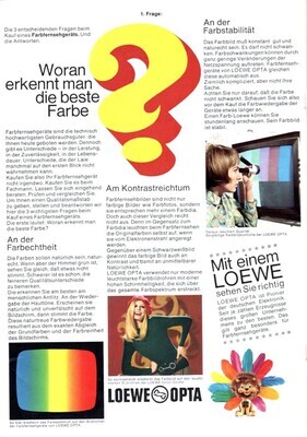 Verkaufsprospekt der Firma Loewe Opta. Gültig für die Jahre 1969/1970. Auf 48 Seiten wird das Gesamtprogramm (Fernsehgeräte, Radio, Musiktruhen, Kofferradio, Cassetten-Recorder vorgestellt, ergänzt mit vielen interessanten Details aus der Firmengeschichte. Für die Kofferradios wirbt der, damals sehr bekannte Schlagerstar, Roy Black. (1943-1991 - 1969 waren alle seine Singles in den Top 10)