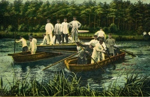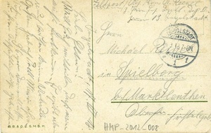 Auf der Vorderseite: Die querformatige, nachbearbeitete Fotopostkarte zeigt "Pioniere beim Brückenbau". Zwei Ruderboote überschiffen einiges Baumaterial. Auf der Rückseite: Adressat: "Feldpost / Abs. Pion. A. Reinel / 3. (...) Batl. Inf. II / (...) 13. Ingolstadt. / Herrn / Michael Reinel / in Spielberg / b. Marktleuthen / Oberfr. Fichtelgeb.", Stempel: "Ingolstadt (?) 3. 18. 7 - 8 N", Serie: "B.B. & O.L.G.M.B.H.". Handschriftlicher Text: "Ingolstadt, 17.III.18 / Liebe Eltern! / Will Euch mitteilen, daß wir nicht fortkönnen. Es gibt aber auch bisher keinen Urlaub. Gestern habe ich (?)rell Marie ihren Sohn, einen 96ger der entlassen u. hier beschäftigt ist getroffen.".