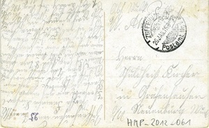 Auf der Vorderseite: Nachkolorierte Fotopostkarte im Hochformat. Landschaft hinzugezeichnet. Überschrift: "Jung Kriegsmann bin ich in stahlblanker Wehr." Dargestellt ist ein junger Soldat in Marschausrüstung. Die rechte Hand liegt auf seinem Herzen, in der Linken hält er das Gewehr. Oben links eine junge Frau als Ganzfigur in Seitenansicht, die sich mit dem Taschentuch die Tränen trocknet. Unten der Text: "Muss scheiden von ihr, die ich liebend erkor. / Dich schütz’ ich, traut’ Mägdlein, mein sonniges Licht! / Halt Treue mir, Holde, vergiss mein nicht.". Auf der Rückseite: Adressat: "Abt. Musk. W. Ahr (???) Feldpost. Herrn Schuldheiß Kircher in Gräfenhausen o/n. (???) Neuenbürg Württ.", Stempel: "Zuffenhausen Postamt Nr. (???) 26. Jan. 15", Serie: "WSSB; 902". Handschriftlicher Text: "Zuffenhausen den 25. Jan. Werthe Familie Kircher! Ich erlaube mir auch einmal eine Karte zu schreiben. Es geht mir in Zuff. bis jetzt immer noch gut. Aber jeden Tag pfeift ein ... Wind. Ich habe schon 8. Tage ... Wann wir ins Feld kommen wissen wir noch nicht aber die längste Zeit sind wir in Zuff. gewesen. Ehe ich ins Feld komme komme ich noch einmal in Urlaub. Es grüßt Euch Musk. W. Ahr (???). 1. Ers. Komp. Inf. Reg. 126 Zuff. 11 K....(???)".