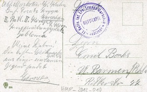 Auf der Vorderseite: "Artillerie in Deckung gegen Flugzeuge.". Handschriftlich auf der Vorderseite aufgeschrieben: "Fröhliche Weihnachten 26.12.015". Auf der Rückseite: Adressat: "Herrn Emil Bocks / W. Barmen/Rhld. / Ritterstr. 47", Stempel: "Briefstempel II. Batln. Inf. Ers. Truppe Warschau (?)ablanna", Serie: "C.G.L. 295". Handschriftlicher Text: "Abs. Musketier W. Kuhn / Inf. Ersatz Truppe II. Batl. II. Komp. 9. Korp. Warschau / Truppenübungsplatz Gablona / Meine Lieben! / Die besten Weihnachtsgrüße aus einer einsamen Gegend sendet Werner".