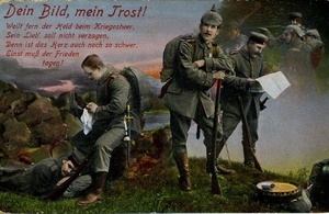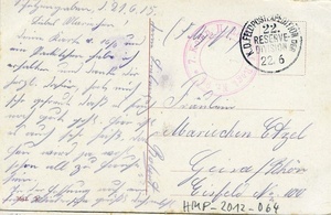 Vorderseite: Querformat. Soldaten im Felde. 4 im Vordergrund, 3 im Hintergrund. Zentrale Person stehend auf Gewehr gestützt schaut aus dem Bild heraus. Ein Soldat schläft, einer säubert seinen Helm, einer besieht ein größeres Schriftstück. Text: "Dein Bild, mein Trost! Weilt fern der Held beim Kriegesheer, Sein Lieb’ soll nicht verzagen, Denn ist das Herz auch noch so schwer, Einst muß der Frieden tagen!"; Rückseite: Adressat: "Fräulein Mariechen Etzel, Geisa/Rhön, Eisfeld No. 100.", Stempel: "K.D. Feldpostexpedition der 22. Reserve-Division 22.6." und "7. Komp. II. Res.-Inf.-Rgt.Nr. 94", Serie: ""Dein Bild, mein Trost!", Serie 3642.3", handschriftlicher Text: "Schützengraben, d. 21.6.15. Liebes Mariechen! Deine Karte v. 16/6 und ein Packetchen habe ich erhalten und danke Dir herzl. dafür, habe mich sehr gefreut daß es Euch noch gut geht. Hier ist es auch sehr heiß, das Heu wird ja wohl schon all zu Hause sein. In der Hoffnung auf ein frohes Wiedersehen grüßt dich, nebst deinen Lieben, Robert."