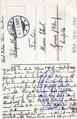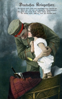 Auf der Vorderseite: Stark nachbearbeitete Fotopostkarte im Hochformat. Ein deutscher Soldat in Feldrock und Mannschaftsfeldmütze, der durch die graugrüne Färbung seiner Kleidung (Waffenrock M 1907) als Jäger oder Schütze identifiziert werden müsste, neigt sich zu einem Kleinkind herab, das in einem Bettchen aus Korbgeflecht steht und ihn zart auf die Wange küsst. Der junge Soldat stützt das Kind sanft an beiden Armen. Das Kind hält in seiner linken Hand noch den Löffel des Soldaten, mit dem es (wie in der vorhergehenden Szene, welche auf einer weiteren Postkarte dieser Serie zu sehen ist, dargestellt) die Suppe des Soldaten essen durfte. An den inneren Rand des Bettchens gelehnt ist ein Laib Brot erkennbar, in dem ein Messer steckt. Im Hintergrund sind Bäume in zurückhaltenden Farben zu erahnen. Überschrift dieser Szene ist:"Deutsches Kriegerherz". Darunter der Vierzeiler: "Du kennst mich nicht und schmiegst dich traulich an, / Merk dir: ich bin ein deutscher Reservemann. / Du gibst mir einen Kuß, mein liebes Kind, / Du fühlst nicht, dass wir hier als Feinde sind." Weitere Szenen zwischen Soldat und Kind mit dem Titel "Deutsches Kriegerherz" bilden zusammen mit diesem Bild eine Serie. Auf der Rückseite: Adressat: "Fräulein Marie Etzel, Geisa (Rhön), Eisfeld. Abs.: Etzel Fulda, Herz-Jesuheim.", Stempel: "Fulda 10.7.15", außerdem: "Herz-Jesuheim Orthopädische Anstalt der barmherzigen Brüder Fulda, Butlarstrasse 74 Telefon 122", Serie: "K&K; Deutsches Kriegerherz, Serie 2609/5". Handschriftlicher Text: "Liebe Marie! Deinen lieben Brief habe ich erhalten und mich sehr gefreut über denselben der Ausgang ist jetzt Donnerstags nicht mehr am Freitag. Frau Lergert / Luise habe ich am Bahnhof getroffen, die mir alle Neuigkeiten von dort erzählten. Als ich nach Hause kam, lag dann dein Brief auf der. (hier fehlt wohl ein Wort) Von Rudolf habe ich gestern eine Karte bekommen. Die Paketchen hatt er bekommen. Er schreibt, daß sein Urlaub genehmigt sei, wann er kommt weiß er aber nicht. Meine Karte werdet Ihr ja erhalten haben. Mit herzlichen Grüßen an Euch d. Br. Emil.".
