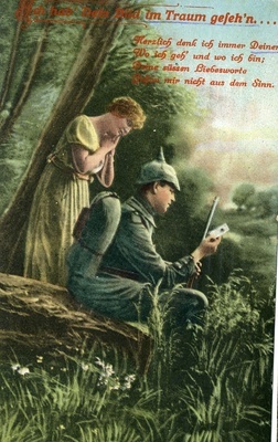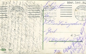 Auf der Vorderseite: Hochformatige Bildpostkarte mit der Überschrift: "Ich hab Dein Bild im Traum geseh’n...." ("im Traum geseh’n" wurde von Hand unterstrichen). Dargestellt ist die Seitenansicht eines auf einem Baumstamm sitzenden Soldaten, der sinnend auf ein Stück Papier oder ein Foto blickt. Ihm schaut unbemerkt, wohl eine Traumgestalt, eine junge Frau über die Schulter. Aufgedruckter Text: "Herzlich denk ich immer Deiner ("Herzlich" und "Deiner" wurde von Hand unterstrichen), Wo ich geh’ und wo ich bin; / Deine süssen Liebesworte / Gehen mir nicht aus dem Sinn.". Auf der Rückseite: Adressat: "Frl. Lina Baumgartner / i. Hart / Post Mühldorf a.I. / Abs. Resv. P(...)huber 1. Inft. Regt. / 1. Cas. Batt. 7 (...) / München (...)", Stempel: "München 9.2.18", Serie: "B.N.K; 5040". Handschriftlicher Text: "München den 8 abends./17 / Liebe Lina! Zum Zeichen, dass ich Dich nicht vergessen hab (...), sende ich Dir dies Kärtchen, ich hoffe, dass es Dich in bester Gesundheit u. frohen Muthes antrifft. Hoffentlich bist Du doch noch beim alten (...) (...) auch ich es noch bin. Nun (...) Linalein wie geht es Dir (...), hast aber schon lange nichts mehr von Dir hören lassen, warum nicht? Bei uns gibt es jetzt bis 19(...) (...) keinen Urlaub mehr, schon seit 14 Tagen nicht mehr. Auch haben wir wieder Musterung gehabt, ich bin (…) (...) (...), u. bin (...). Auf Wiedersehen (...) (...) Gruß u. K. Dein (...) (...) (...) (...) (...) (...) (...) (...) (...) (...).