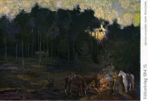 Auf der Vorderseite: Gemälde im Querformat mit dem Obertitel "Völkerkrieg 1914" und mit dem Untertitel "Ulanenvorposten beim Abkochen". Signatur u.l.: Clemens Fränkel 1915 (?). Auf der Rückseite: Adressat: "Fräulein Emma Röhm / Reutlingen / Krämerstr. 39", Stempel: "Sondelfingen 10. Jul 15", Serie: "Gebr. Metz, Tübingen; No. 113", Postwertzeichen: "Deutsches Reich Germania". Der handschriftliche Text lautet: "Sondelfingen, 9. Juli 1915. Liebes Fräulein Röhm! Möchte Ihnen mitteilen, daß ich nun am Sonntag nicht nach Reutl. komme, hoffe deshalb Sie nächste Woche einmal hier zu sehen. Alles andere mündlich. Mit herzlichem Gruß, Ihre Hedwig Grubg. (?)".