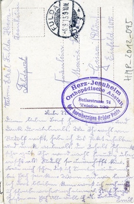Vorderseite: Stark nachbearbeitete Fotopostkarte im Hochformat. Ein deutscher Soldat in Feldrock und Mannschaftsfeldmütze, der durch die graugrüne Färbung seiner Kleidung (Waffenrock M 1907) als Jäger oder Schütze identifiziert werden müsste, neigt sich zu einem Kleinkind in einem Bettchen aus Korbgeflecht herab und gibt diesem aus einer hellen (Porzellan-?) Schüssel mit einem goldfarbenen Löffel zu essen. Mitfühlend blickt der junge Soldat auf das nur mit Nachtwäsche bekleidete und von einer über den Rand des Korbes geschlagenen Steppdecke halb verdeckte Kind herab. Im Hintergrund sind Bäume und Waldboden in zurückhaltenden Farben zu erahnen, welche wohl eine Waldlichtung andeuten sollen. Überschrift dieser Szene ist: "Deutsches Kriegerherz". Darunter der Vierzeiler: "Du hast gerufen, bist vom Schlaf erwacht - schnell habe ich mein Süppchen dir gebracht. Nun koste mal, ich glaube, es schmeckt schön, Ich bleib bei dir, denn niemand ist zu seh’n." Weitere Szenen zwischen Soldat und Kind mit dem Titel "Deutsches Kriegerherz" bilden zusammen mit diesem Bild eine Serie.; Rückseite: Adressat: "Fräulein Marie Etzel, Geisa (Rhön), Eisfeld 100. Abs.: Wehrm. Etzel Fulda Herz-Jesuheim.", Stempel: "Fulda 6.9.15", außerdem: "Herz-Jesuheim Orthopädische Anstalt der barmherzigen Brüder Fulda, Butlarstrasse 74 Telefon 122", Serie: "K&K; Deutsches Kriegerherz, Serie 2609/1", handschriftlicher Text: "Liebe Marie! Deinen lieben Brief habe ich erhalten und danke dir vielmals. Wie Ihr wohl von Rudolf wißt, habe ich das Paket erhalten und danke vielmals. Der Inhalt schmeckt sehr gut. Ihr ward wohl freudig überrascht, als Rudolf so unverhofft kam. Freue mich schon, dass ich Sonntag wieder mal bei Euch sein kann. Wann und wie lange ich dort bleiben kann weiß ich noch nicht. Ich schreibe vorher noch einmal. Mit herzl. Grüßen an Euch Alle verbl. ich d. Bruder Emil."