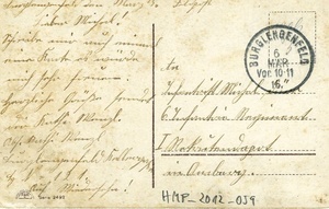 Auf der Vorderseite: Nachkolorierte Fotopostkarte im Hochformat, Überschrift: "Lustig, ihr Leute, Soldaten sind da. Darunter: Lustig, ihr Leute, Soldaten sind da, Grüssen euch singend, Juchheirassasa." Ein Soldat in Ulanenuniform, sein Pferd am Zügel haltend, legt einer jungen Frau die Hand auf die Schulter, die gerade aus einem Brunnen Wasser holt. Im Hintergrund mittelalterliche Architektur. Auf der Rückseite: Adressat: "Infantrist Michel Dürr, 6. Infantrie Regiment, I Rekrutendepot in Amberg.", Stempel: "Burglengenfeld 6 Mär Vor. 10-11 15", Serie: "R. & K. L.; 2492". Der handschriftliche Text lautet: "Burglengenfeld den März 15. Lieber Michel! Schreibe mir auch einmal eine Karte es würde mich sehr freuen. Herzliche Grüße sendet dir Kathi Wenzl. Abs. Kathi Wenzl, Burglengenfeld Kellergasse H Nr 121. Auf Wiedersehn!".