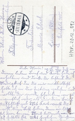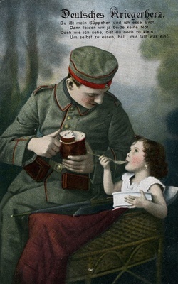 Auf der Vorderseite: Stark nachbearbeitete Fotopostkarte im Hochformat. Die Postkarte wurde per Feldpost an Fräulein Marie Etzel nach Geisa (Rhön) versandt und trägt den Fuldaer Poststempel vom 03.11.1915. Die Vorderseite zeigt eine Szene der Barmherzigkeit: Ein deutscher Soldat in Feldrock und Mannschaftsfeldmütze, der durch die graugrüne Färbung seiner Kleidung (Waffenrock M 1907) als Jäger oder Schütze identifiziert werden müsste, sitzt auf dem Rand eines geflochtenen Korbbettchens und blickt teilnahmsvoll auf ein darin sitzendes Kleinkind herab, das eine weiße (Porzellan-?) Schüssel hält und mit einem Löffel daraus isst. Der Soldat selbst, an dessen Gürtel zwei Patronentaschen erkennbar sind, schneidet mit seinem Messer eine Scheibe Brot von einem Laib. Sein Seitengewehr liegt neben ihm auf dem Rand des Bettchens. Im Hintergrund sind Bäume in zurückhaltenden Farben zu erahnen. Überschrift dieser Szene ist: "Deutsches Kriegerherz". Darunter der Vierzeiler: "Du ißt mein Süppchen und ich esse Brot, Dann leiden wir ja beide keine Not. Doch wie ich sehe, bist du noch zu klein, Um selbst zu essen, halt! mir fällt was ein!" Weitere Szenen zwischen Soldat und Kind mit dem Titel "Deutsches Kriegerherz" bilden zusammen mit dieser Szene eine Serie. Auf der Rückseite: Adressat: "Fräulein Marie Etzel, Geisa (Rhön), Eisfeld 100. Abs.: Wehrm. Etzel Fulda Herz-Jesuheim.", Stempel: "Fulda 3.11.15", Serie: "Deutsches Kriegerherz, Serie 2609/2". Der handschriftliche Text lautet: "Liebe Marie! Deinen lieben Brief und Karte habe ich erhalten und danke dir bestens. Die Neuigkeit die du mir mitteiltest hatte ich in der Zeitung gelesen und wollte dir gerade schreiben, wer es eigentlich war, als mir dein Brief Aufschluß gab. Mit Kurt wirst du wohl keine Lust haben, denn er läßt sich gerne tragen. Schreib bald mal, wie er sich gestellt hat. Mit herzlichen Grüßen an Euch alle d. Br. Emil".