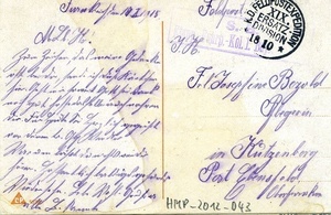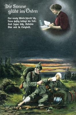 Auf der Vorderseite: Stark nachbearbeitete Fotopostkarte im Hochformat. Ein verletzter Soldat übergibt Kameraden einen Brief. Oben links die junge Dame beim Lesen der Zeilen. Überschrift: "Die Sonne glüht im Osten." Text: "Nur wenig Worte schreib’ ich, Denn hastig drängt die Zeit: Gott segne dich, Geliebte Hier und in Ewigkeit.". Auf der Rückseite: Adressat: "I.H. / Frl. Josephine Bezold / Pflegerin / in Kutzenberg / Post Ebensfeld / Oberfranken", Stempel: "K.D. Feldpostexpedition XIX. Ersatzdivision 18.10." und "S.B. Etapp.-Fuhrp.-Kol. 1 Bay(?).". Aus der Serie: "L&P; 5678". Der handschriftliche Text lautet: "Frankreich, den 18.X.1915. M. Lb. H.! Zum Zeichen, das meine Gedanken oft bei dir, sende ich dies Kärtchen hier. Geht mir soweit Gott sei Dank noch gut hoffe (...) (...) von Dir. Für (...) S(..) herzlich gegrüßet von deinem (...) (...) (...) (...) (...) hören. Hoffentlich (...) (...) gesundes Wiedersehen. (...) (...) (...) (...) B. (...)".