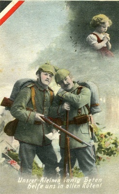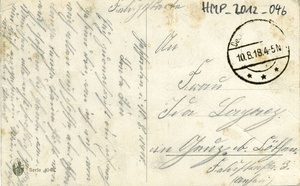 Auf der Vorderseite: Nachkolorierte Fotopostkarte im Hochformat. Zwei Soldaten in Marschausrüstung als Kniebild. Oben rechts ein noch sehr kleines betendes Mädchen, die linke obere Ecke queren drei Streifen in den Farben der deutschen Reichsflagge. Unterschrift: "Unsrer Kleinen innig Beten / helfe uns in allen Nöten!". Auf der Rückseite: Adressat: "Frau Ida (...) / in Geuz b. Köthen / Feldstraße 3 / (Anhalt)", Stempel: "10.8.18 4-5 N", Serie: "4040", handschriftlicher Text: "Geschrieben, d. 18.8.1918. Liebe Ida, Euch (...) das ich noch gesund bin, was ich auch von euch allen auch hoffe, aber (...) (...) lange lange (?) (...) (...) nun euch, hoffentlich (...) (...). (...) (...) (...) (...) (...) und auf (...) Wiedersehen von (...) (...)"
