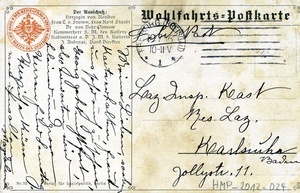 Auf der Vorderseite: Künstlerpostkarte im Hochformat ohne Signatur. Bild ist von weißem Rand eingefasst, Unterschrift: "Gefecht mit Indern". Zu sehen sind deutsche Soldaten die aus einem Schützengraben mit Gewehren auf heranstürmende Soldaten mit Turbanen feuern. Auf der Rückseite: Aufdruck: "Wohlfarts-Postkarte", Adressat: "Feldpost / Laz. Insp. Kast / Ber. Laz. / Karlsruhe Baden / Jollystr. 11", Stempel: "Freiburg (Breisgau) (???) 16. 10 - 11 V.". Aus der Serie: "Verlag für Sozialpolitik, Berlin; Nr. 10". Der handschriftliche Text lautet: "Meine Lieben, soeben Karte erhalten, freut uns sehr euch zu sehen, Georg geht nicht fort, also erwarten wir (...) und (...) Herren für Sonntag. Herzliche Küsse von uns allen / Magdalena".