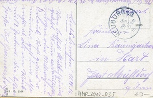 Auf der Vorderseite: Nachkolorierte Fotokarte im Hochformat, Überschrift "Es war ein Sonntag hell und klar." Soldat mit Schirmmütze hält die Hand seiner Liebsten. Unterschrift: "Es war ein Sonntag hell und klar, Ein selten schöner Tag im Jahr; Wir beide gingen durch das Korn, Durch Feld und Au, durch Busch und Dorn.". Auf der Rückseite: Adressat: "Fräulein Lina Baumgartner / in Hart / Post Mühldorf a. Inn", Stempel: "Neuburg a.D. 18. Dez. 4 - 5 Nm. 16", Serie: "WSSB; 1104", handschriftlicher Text: "18.12.16. Liebes Linachen! Vom Lechfeld glücklich zurück gekehrt. Komme voraussichtlich morgen oder Mittwoch in Urlaub. Sonst gesund u. munter, geht mir also nichts ab, als ein Weib mit 2 Zentner. Die besten Grüße Jos. Gramersberger. Abs. Gef. Gramersberger Jos. 15.I.R.1. (...) Batl. Komp. Neuburg".