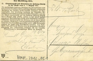 Auf der Vorderseite: Druckgrafik, Querformat. Überschrift: "Feldskizze." Die Erstürmung der Festung Lüttich". Auf der Rückseite: Adressat: "Herrn Bernhard Spieß (?), Colmar Oberthal (???), Theo Wig... I (???).". Aus der Serie: "W&N, ALG; No. 15". Außerdem ein längerer, gedruckter Text über "Sturmangriff und Einnahme der Festung Lüttich in der Nacht vom 6. - 7. August 1914", darunter handschriftlich: "21.9.14. Freundl. Grüße sendet dir dein Freund Charles."
