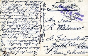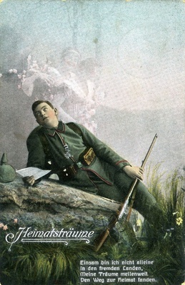 Auf der Vorderseite: Nachkolorierte Fotopostkarte im Hochformat. Überschrift: "Heimatsträume." Ein junger Soldat halb liegend auf einem Felsblock, den Blick gedankenverloren gen Himmel gerichtet, einen Brief in der Hand. Im oberen Bildbereich sind schwach die Gestalten von zwei blumengeschmückten jungen Frauen zu erkennen. Text: "Einsam bin ich nicht alleine In den fremden Landen. Meine Träume meilenweit Den Weg zur Heimat landen." Auf der Rückseite: Adressat: "Frau K. Wassmer / St. Johannstr. No. 7 / in Bühl Ober/Elsass / Kreis-Gebweiler.", Stempel: "Thorn 8.3.17", Serie: "L&P; 5893/II", handschriftlicher Text: "No. 93. Thorn, den 7.III.17. Meine lb. Frau und lb. Kind! Deine schöne Karte No. 57 mit großer Freude erhalten, habe gesehen, daß ihr noch immer gesund seid, was bei mir auch der Fall ist. Wie ich sehe so habt ihr auch Schnee, wir haben hier sehr kalt bis gegen 18 Grad, aber ich bin bis heute noch immer in der Wärme. Nun bete ich jeden Tag zum lb. Gott damit ihr alle Gesund bleibt in eurer lb. Heimat. Nun grüße und küße ich dich und die lb. Germaine von Herzen. Abs. Landsturmmann R. Wassmer / Festung - Komp. No. 2 in Thorn.".