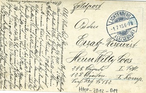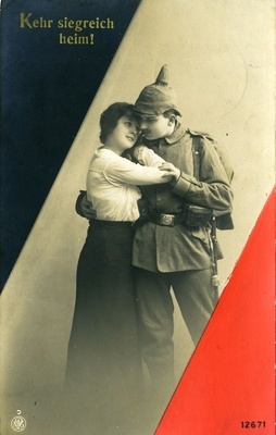 Auf der Vorderseite: Fotopostkarte im Hochformat. Die Fotografie, welche ein Liebespaar aus Soldat und bürgerlich gekleideter, junger Frau zeigt, ist nicht nachkoloriert. Eine Bearbeitung liegt nur in Form der Beifügung eines roten und eines schwarzen diagonalen Balkens vor, welche die Fotografie an linkem oberen und rechtem unteren Rand einfassen und zusammen mit dem hellen Hintergrund der Fotografie den Farbdreiklang der deutschen Reichsflagge bilden. In goldener Schrift auf schwarzem Grund oben links: "Kehr siegreich heim!". Auf der Rückseite: Adressat: "An den / Ersatz-Reservist / Herrn Willy Loos / 245. Brigade / 123. Division / Inf. Reg. No. 182 / I. Btl. / I. Komp.", Stempel: "Lichtenberg (Erzgebirge) 1.7.15. 6 - 7 N", Serie: "NPG; 12671", handschriftlicher Text: "Abs. Salena Loos, Weigmannsdorf. Post Lichtenberg i. Sachsen / Herzlieber Willy! Gestern erhielt ich Dein Paketchen mit den Briefen. Es besorgt mich recht mein Lieber, warum hast Du denn Deinen Affen müssen zurücklassen. Wenn doch der schreckliche Krieg bald ein Ende nähme, und Du kämst wieder zu mir, die große Sorge um Dich drückt immer Tag und Nacht. Hoffentlich ist es Gottes Wille dass wir uns bald wieder sehen. Wie geht es Dir? Soweit, sind wir Gott sei Dank alle gesund und hoffen es auch von Dir. Mit heimatlichem Gruß und süßem Kuss Deine Salena (...) u. (...)"