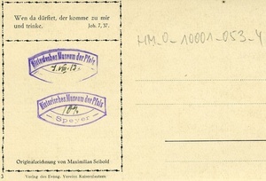 Auf der Vorderseite: Reproduktion einer Zeichnung von Maximilian Seibold. Auf der Rückseite: Verlag: "Verlag des Evang. Vereins Kaiserslautern, Nr. 3", Aufdruck: "Wen da dürstet, der komme zu mir und trinke. Joh. 7, 37.", unbeschriftet.