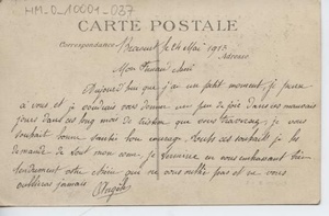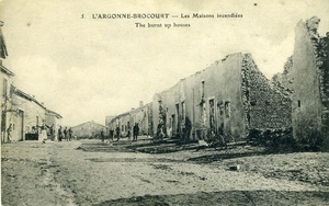 Auf der Vorderseite: Zerstörte Häuser in Brocourt en Argonne, Fotografie. Titel: "5. L’Argonne-Brocourt - Les Maisons incendiées. The burnt up houses". Auf der Rückseite ist der handschriftlicher Text: "Brocourt, le 24. Mai 1915. Mon Fernand chéri. Aujourd’hui que j’ai un petit moment, je pense à vous, et je voudrais vous donner un peu de joie dans ces mauvais jours dans des long mois de tristesse que vous traversez, je vous souhaite bonne santée bon courage, touts ces souhaits je les demande de tout mon coeur, je termine en vous embrassant bien tendrement votre chérie qui ne vous oblie pas et ne vous oublieras jamais, Angèle"; Übersetzung: Brocourt, den 24. Mai 1915. Mein Liebling Fernand. Heute, da ich einen kleinen Moment habe, denke ich an Sie und ich würde Ihnen gern ein bisschen Freude in diesen schlimmen Tagen in den langen Monaten der Traurigkeit geben, die sie durchleben, ich wünsche Ihnen starke Gesundheit, viel Mut, diese Wünsche spreche ich von ganzem Herzen aus. Ich schließe und umarme Sie sehr liebevoll. Ihre Liebste, die Sie nicht vergisst und niemals vergessen wird, Angèle.