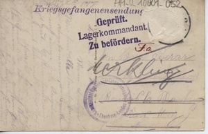 Auf der Vorderseite: Fotografie von Gymnasium und Realschule in Landau (Pfalz). Auf der Rückseite: Adressat: "Herr Bérar in Montois la Montagne im Kreis Metz", Verlag: "Verlag von Emil Hartmann Strassburg i.E.", Stempel: "Kriegsgefangenensendung Geprüft Lagerkommandant Zu befördern". Der handschriftliche Text ist stark verblasst: "Meine Lieben! Wir sind alle Sonntagsmorgens hier angekommen, (...) (...) (...) (...) Zeit. Angele geht gut. Gestern sind wir ge(...) worden. Die (...) schmeckt so u. so gut. Schlafen tun wir auf Stroh in einem ganz großen Saal. Auf Wiedersehn meine Lieben. Grüßet alle Bekannten für uns. Betet damit Gott uns schütze auf unserer großen Reise. F.G."
