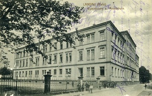 Auf der Vorderseite: Fotografie von Gymnasium und Realschule in Landau (Pfalz). Auf der Rückseite: Adressat: "Herr Bérar in Montois la Montagne im Kreis Metz", Verlag: "Verlag von Emil Hartmann Strassburg i.E.", Stempel: "Kriegsgefangenensendung Geprüft Lagerkommandant Zu befördern". Der handschriftliche Text ist stark verblasst: "Meine Lieben! Wir sind alle Sonntagsmorgens hier angekommen, (...) (...) (...) (...) Zeit. Angele geht gut. Gestern sind wir ge(...) worden. Die (...) schmeckt so u. so gut. Schlafen tun wir auf Stroh in einem ganz großen Saal. Auf Wiedersehn meine Lieben. Grüßet alle Bekannten für uns. Betet damit Gott uns schütze auf unserer großen Reise. F.G."