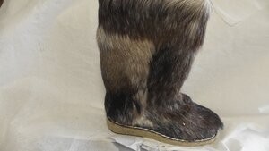 Ein einzelner Damenstiefel aus Fell. Der Farbton des Fells ist eine Art Hellbraun, das leicht rötlich schimmert. Eckige Form, Absatz (ca. 3cm). Hergestellt von der Firma Salamander in Kornwestheim (D). Leider sehr ungenau datiert.