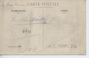 Auf der Vorderseite: Luftansicht Camp de Mailly. Titel: "Au Camp.- Vue génerale". Auf der Rückseite: Verlag: "Visé Nancy a. 4315. A. Verry, éditeur", handschriftlich: "Camp de Mailly".