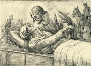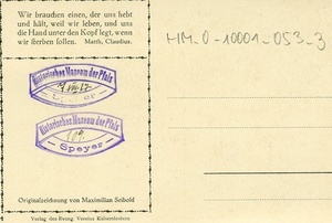 Auf der Vorderseite: Reproduktion einer Zeichnung von Maximilian Seibold. Auf der Rückseite: Verlag: "Verlag des Evang. Vereins Kaiserslautern, Nr. 4", Aufdruck: "Wir brauchen einen, der uns hebt und hält, weil wir leben, und uns die Hand unter den Kopf legt, wenn wir sterben sollen. Matth. Claudius.", unbeschriftet.