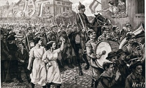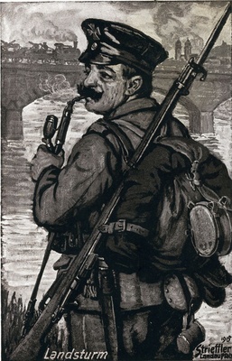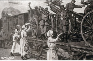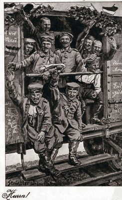 Auf der Vorderseite: Reproduktion eines Gemäldes von Heinrich Strieffler mit dem Titel "Transport Verwundeter im Weltkrieg". Signatur: Strieffler Landau Pf. 1914. Die Rückseite ist unbeschriftet.
