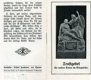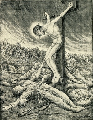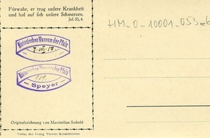 Auf der Vorderseite: Reproduktion einer Zeichnung von Maximilian Seibold. Auf der Rückseite: Verlag: "Verlag des Evang. Vereins Kaiserslautern, Nr. 1", Aufdruck: "Fürwahr, er trug unsere Kankheit und lud auf sich unsere Schmerzen. Jes. 53,4.", unbeschriftet.