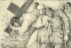 Vorderseite: Reproduktion einer Zeichnung von Maximilian Seibold; Rückseite: Verlag: "Verlag des Evang. Vereins Kaiserslautern, Nr. 2", Aufdruck: "Er war der Allerverachtetste, voller Schmerzen und Krankheit. Jes. 53,3.", unbeschriftet