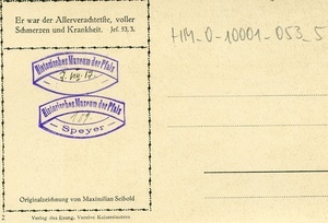Vorderseite: Reproduktion einer Zeichnung von Maximilian Seibold; Rückseite: Verlag: "Verlag des Evang. Vereins Kaiserslautern, Nr. 2", Aufdruck: "Er war der Allerverachtetste, voller Schmerzen und Krankheit. Jes. 53,3.", unbeschriftet