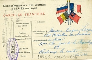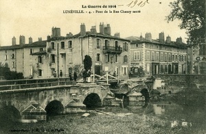 Auf der Vorderseite: Lunéville. Zerstörte Brücke der Rue Chanzy. Fotografie. Titel: "La Guerre de 1914 - 1915. Lunéville. - 4. - Pont de la Rue Chanzy sauté". Auf der Rückseite ein handschriftlicher Text: "Melay le 15 Juin 1915. Cher Cousin. Je fais réponse à ta carte qui nous à bien fait plaisir de savoir de tes nouvelles qui sont toujours bonne. Nous sommes en bonne santé pour le moment et j’éspère que ma carte te trouveras de même tu nous dis qu’il à fait un orage chez vous. presque tous les jours nous en avons. il fait une chaleur à n’y pas tenir et tous les soirs nous avons le tonnerre et la pluie. Je suis bien contente des cartes que tu envoie car j’aime beaucoup les vues. Je vois rien autre à te dire nous t’envoyons bien le bonjour en attendant de tes nouvelles. Bientôt ta cousine Félicie". Übersetzung: "Melay, den 15. Juni 1915. Lieber Cousin. Ich antworte auf deine Karte, die uns sehr erfreut hat, da wir nun deine Neuigkeiten kennen, die immernoch gut sind. Wir sind im Moment gesund und ich hoffe, dass meine Karte dich ebenso vorfinden wird. Du sagst uns, dass es bei euch Sturm gegeben hat. Wir hatten ihn fast jeden Tag. Hier ist eine Hitze, die kaum auszuhalten ist, und jeden Abend haben wir Donner und Regen. Ich bin sehr glücklich über die Karten, die du schickst, denn ich sehe sie sehr gern. Ich weiß sonst nichts mehr zu erzählen. Wir senden dir einen lieben Gruß und warten auf deine Neuigkeiten. Bis bald. Deine Cousine Félicie"