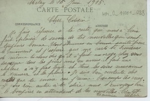 Auf der Vorderseite: Lunéville. Zerstörte Brücke der Rue Chanzy. Fotografie. Titel: "La Guerre de 1914 - 1915. Lunéville. - 4. - Pont de la Rue Chanzy sauté". Auf der Rückseite ein handschriftlicher Text: "Melay le 15 Juin 1915. Cher Cousin. Je fais réponse à ta carte qui nous à bien fait plaisir de savoir de tes nouvelles qui sont toujours bonne. Nous sommes en bonne santé pour le moment et j’éspère que ma carte te trouveras de même tu nous dis qu’il à fait un orage chez vous. presque tous les jours nous en avons. il fait une chaleur à n’y pas tenir et tous les soirs nous avons le tonnerre et la pluie. Je suis bien contente des cartes que tu envoie car j’aime beaucoup les vues. Je vois rien autre à te dire nous t’envoyons bien le bonjour en attendant de tes nouvelles. Bientôt ta cousine Félicie". Übersetzung: "Melay, den 15. Juni 1915. Lieber Cousin. Ich antworte auf deine Karte, die uns sehr erfreut hat, da wir nun deine Neuigkeiten kennen, die immernoch gut sind. Wir sind im Moment gesund und ich hoffe, dass meine Karte dich ebenso vorfinden wird. Du sagst uns, dass es bei euch Sturm gegeben hat. Wir hatten ihn fast jeden Tag. Hier ist eine Hitze, die kaum auszuhalten ist, und jeden Abend haben wir Donner und Regen. Ich bin sehr glücklich über die Karten, die du schickst, denn ich sehe sie sehr gern. Ich weiß sonst nichts mehr zu erzählen. Wir senden dir einen lieben Gruß und warten auf deine Neuigkeiten. Bis bald. Deine Cousine Félicie"