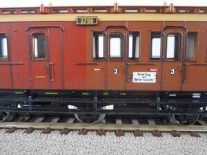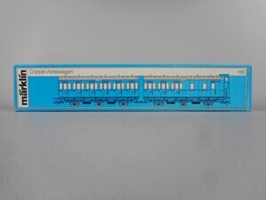 Märklin 4209 3-achsige Personenwagen- Doppeleinheit 3. Klasse der Königlich Preußischen Eisenbahn Gesellschaft. Aufbau mit Bremserhaus und durchgehendem Oberlichtaufbau mit Lüftern auf dem Dach. Der Wagen mit dem Bremserhaus besitzt ein Dienstabteil, dessen Außenseite in einem anderen Braunton gestrichen ist. Durchgehende Trittbretter an den Längsseiten. Betriebsnummer 3798. Die 3-achsigen preußischen Abteilwagen sind in großer Stückzahl seit Ende des 19. Jahrhunderts hergestellt worden und waren Jahrzehntelang im Nahverkehr unverzichtbar. Jedes Abteil hatte eine eigene Tür, so dass Ein- uns Aussteigen in kurzer Zeit möglich war. Die Doppeleinheiten bestanden aus 2 kurzgekuppelten 3-Achsern und wurden bei der Berliner Ring- und Vorortbahn eingesetzt, dem Vorläufer der Berliner S-Bahn. Wagenkasten dunkelbraun mit bunter Beschriftung, Dach ockerbraun, Fahrgestell schwarz mit weißer und gelber Beschriftung und durchgehenden Trittbrettern. Speichenräder, Kurzkupplungs-Kinematik. Beidseitig "Fleischmann Profi-Kupplung" (Kurzkupplung) Baugröße H0 (Maßstab 1:87) 2-Leiter Gleichstrom System (isolierte Achsen) Epoche 1 (Länderbahn-Zeit 1