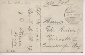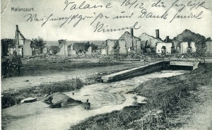 Auf der Vorderseite: Malancourt, bombardiertes Dorf, Fotografie. Titel: "Malancourt.". Auf der Rückseite: Adressat: "Herrn Fehr Senior, Düsseldorf, Düsseldorfer Hof", Verlag: "Kunst- und Verlagsanstalt Schaar & Dathe, Komm.-Ges. a. Akt., Trier. Nr. 96.", handschriftlicher Text: "Feldpost. Abs.: Kummel Res. I. M. K. 39. 8 R. Armee Korps."