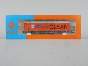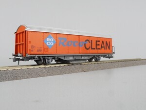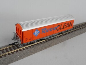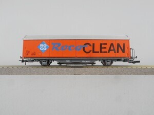Roco H0 46400 Wagen zur Reinigung der Schienen in Form eines 2-achsigen gedecken Güterwagens, eingestellt bei der Schweizerischen Bundesbahn SBB (laut Beschriftung). Am Wagenboden ist ein Schleifstück mit Schleifgummi-Beschichtung federnd befestigt und schleift während der Fahrt Verschmutzungen und Oxidschichten von der Schienenoberkante, so dass die Stromaufnahme von Lokomotiven und Wagen mit Beleuchtung wieder verbessert wird. Wagenkasten orange mit bunter Beschriftung, Dach silbern, Fahrgestell grau. Kupplungen: Standard Bügelkupplung und Roco Kurzkupplung. Zweileiter-Gleichstrom-System Epoche 4 (1970er Jahre - 1990)