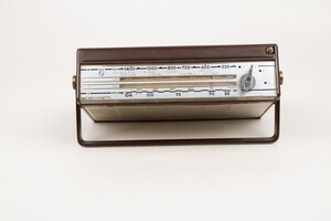 Ein kleines Kofferradio von Philips, aus den Jahren 1965/1966. Die Ausstattung ist auf das notwendigste beschränkt. Die Wellenbereiche werden mittels auffällig gestalteten Drehschalter an der Oberseite angewählt. Die Vorderseite verfügt über zwei waagerecht eingebaute Drehschalter, für Ein/Aus, Laut/Leise und die Sendereinstellung. Das Gerät läuft mit Batteriebetrieb. 5 x 1,5 Volt oder auch mit einem zusätzlichem Netzgerät. Das Gehäuse, aus Thermoplast, ist mit preiswertem, braunem Kunststoff bezogen.