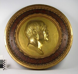 Auf der Vorderseite: Reproduktion eines Porträts Ottos von Bismarck, darunter Bismarcks Unterschrift sowie der Aufdruck "Wir Deutsche fürchten Gott, sonst nichts in der Welt.". Auf der Rückseite: Verlag: "Herausgegeben vom Bayerischen landeskomitee vom Roten Kreuz; Verlag Franz Hanfstaengl, München; Ölgemälde von Franz v. Lenbach", unbeschriftet.